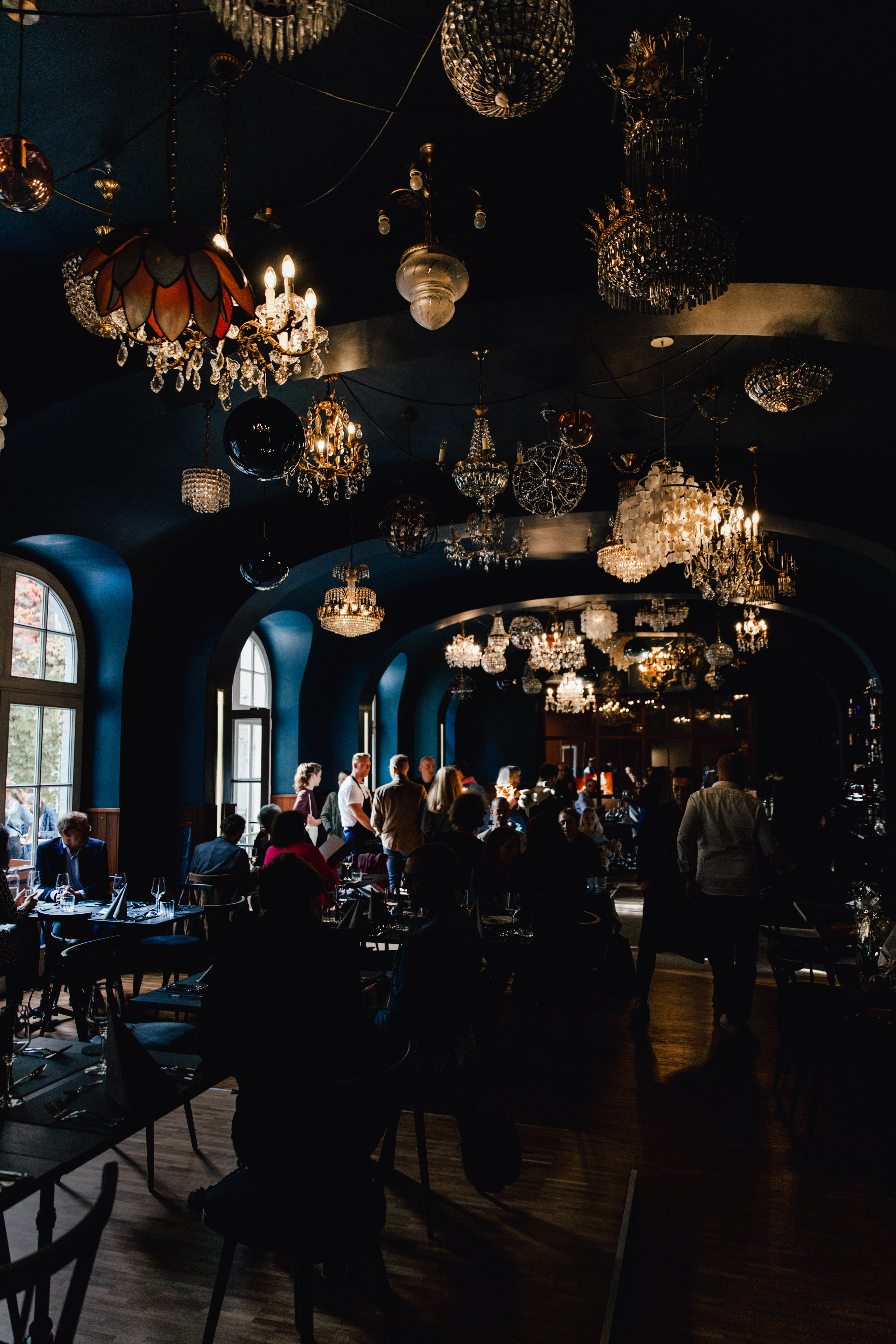 Der denkmalgeschützte Gastraum mit der 4 Meter hohen Decke und den ca. 100 romantischen Kronleuchtern ist sehenswert.