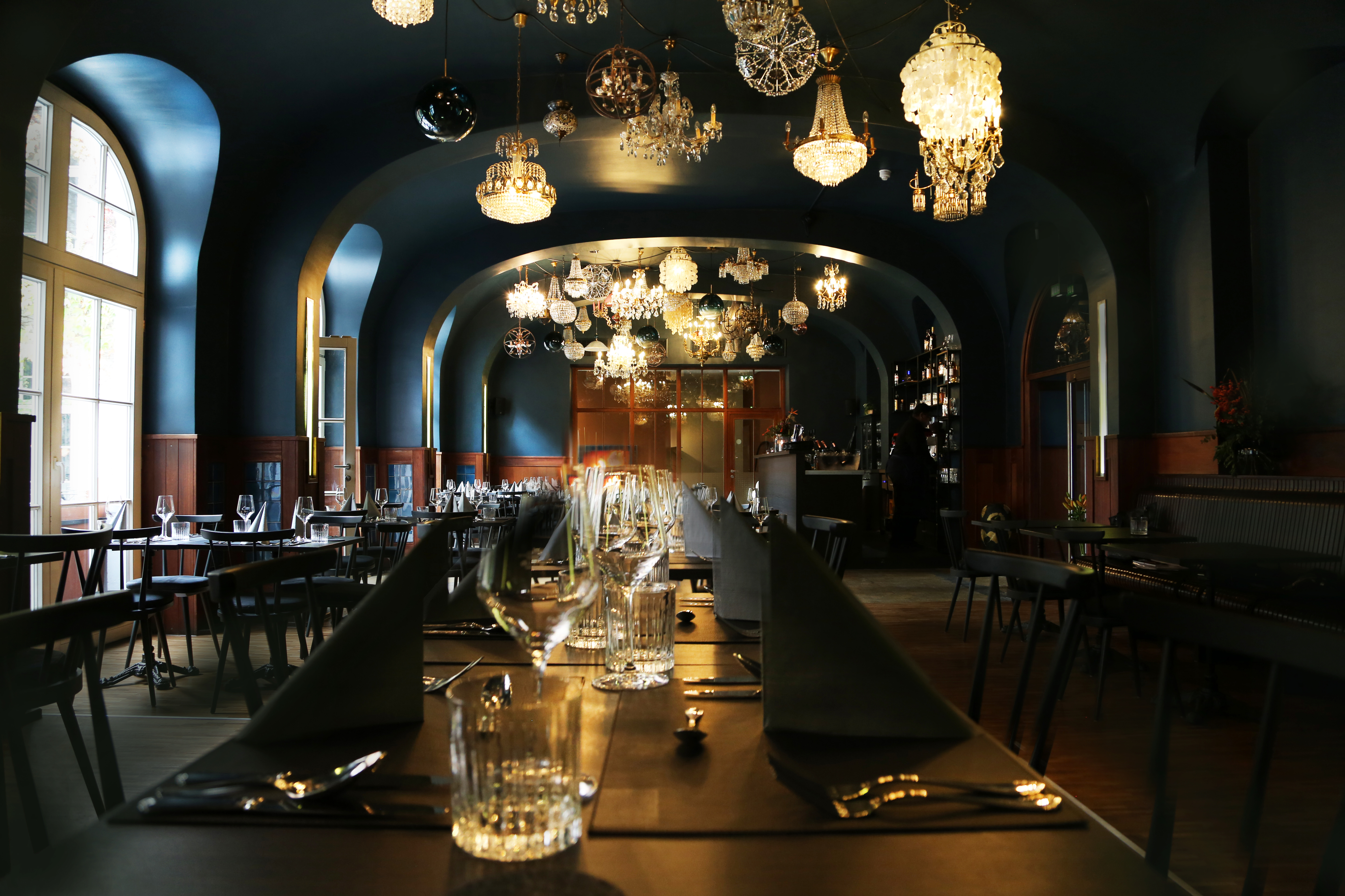 Der denkmalgeschützte Gastraum mit der 4 Meter hohen Decke und den ca. 100 romantischen Kronleuchtern ist sehenswert.